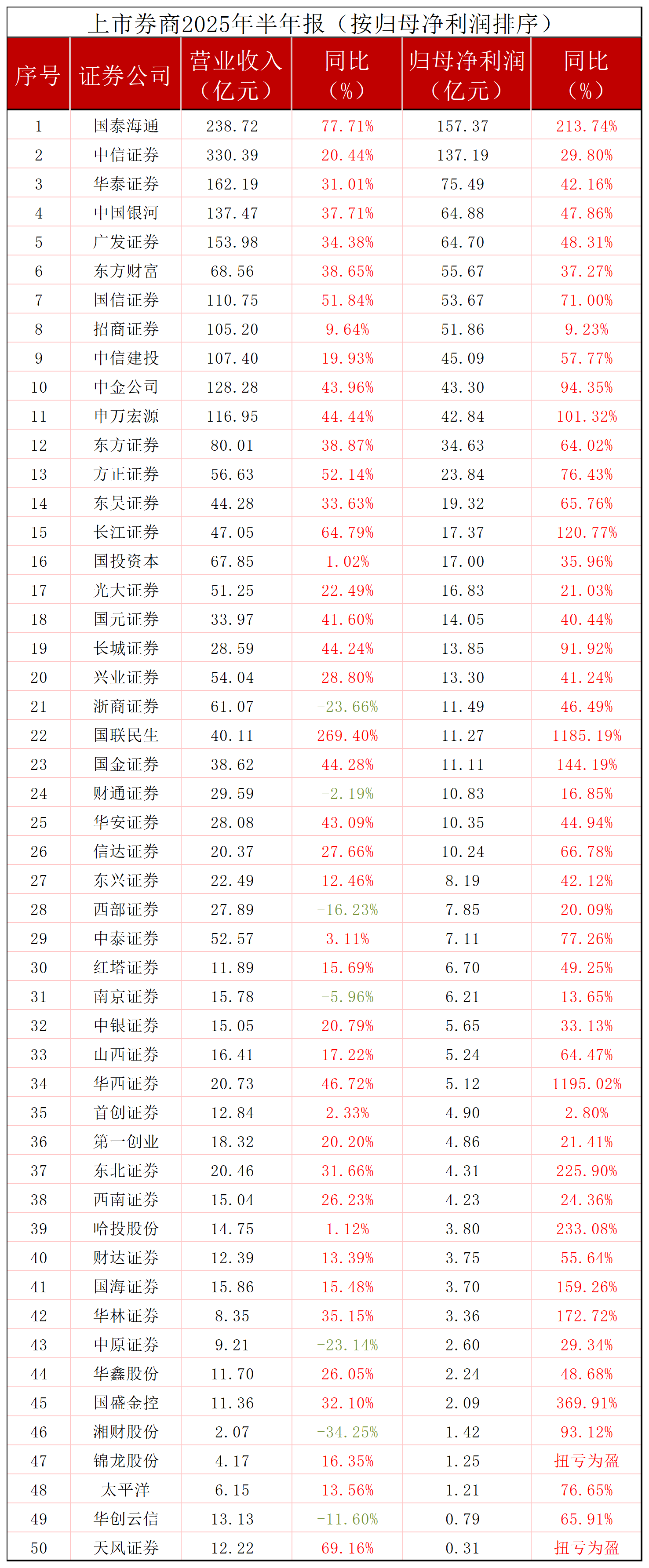 今年上半年50家上市券商的归母净利润同比全部增长,且涨幅惊人:11家涨幅超100%,这其中2家涨幅超1000%。同时,去年亏损的锦龙股份(000712.SZ)、天风证券(601162.SH)双双扭亏为盈。