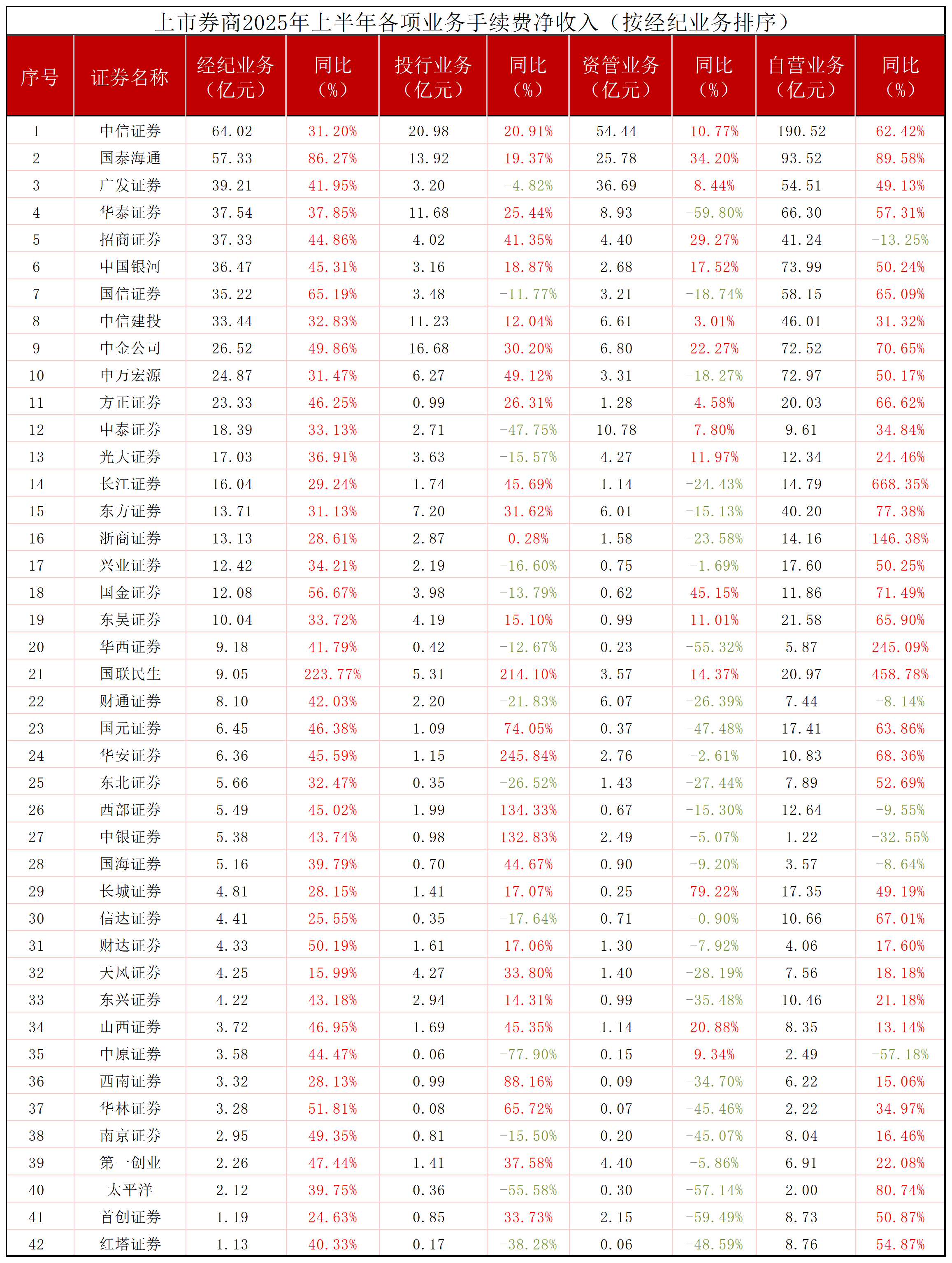 券商的经纪业务也大幅回暖。今年上半年42家券商经纪业务手续费净收入同比均实现增长,净收入合计634.54亿元,同比增长43.98%。而且除了两家“新”券商国联民生、国泰海通外,其他40家券商上半年经纪业务手续费净收入同比涨幅均超15%,其中33家涨幅超三成。