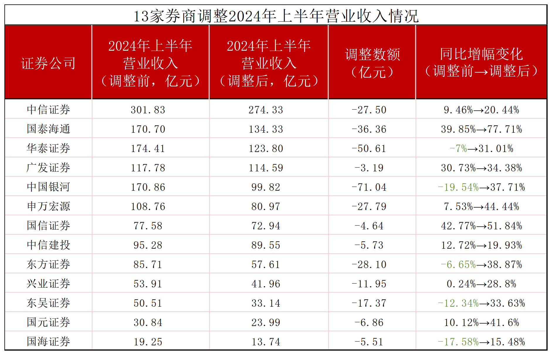 但是财闻注意到,有13家券商在中报里对2024年上半年的营收数据进行大幅下调,并且在数据调整后营收同比涨幅大幅提升,其中华泰证券、中国银河、东方证券、东吴证券(601555.SH)和国海证券(000750.SZ)营收同比涨幅由负转正。